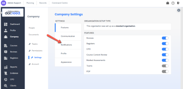 Follow the steps below to manage your fortnightly notifications in the Dacreed platform: