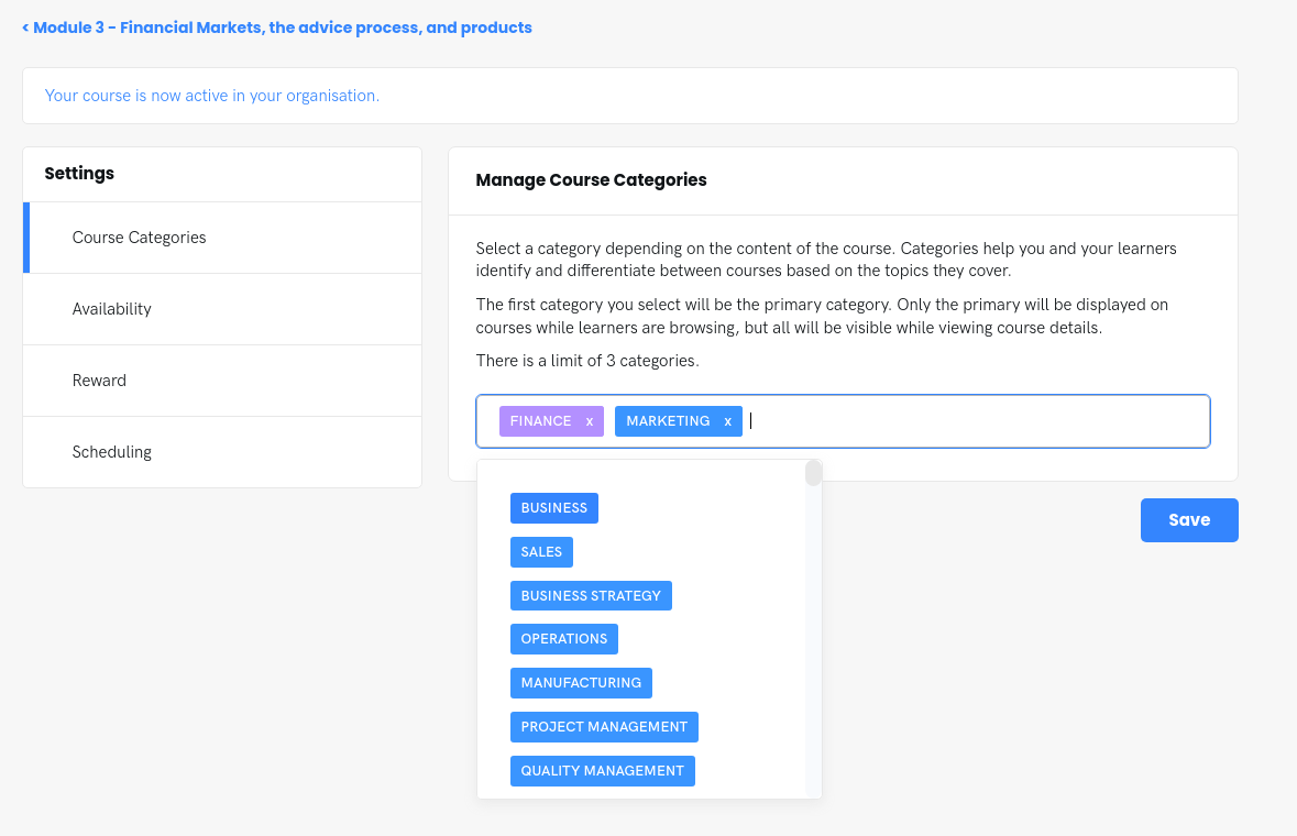- If a change has been made the Admin must select the save button to confirm the change of categories (there is no further confirmation modal window). The Save button will only be actionable by the Admin if a change has been made to the course categories.