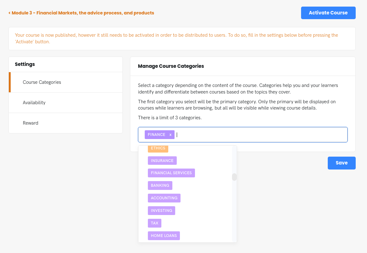 - The first category you select will be the primary category. Only the primary will be displayed on courses while learners are browsing, but all will be visible while viewing course details.