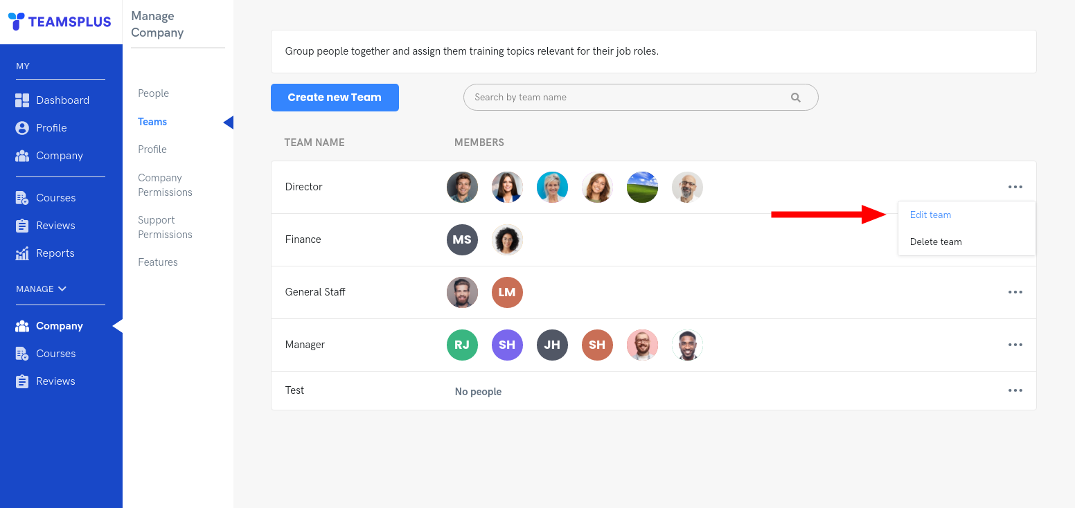 To assign courses, people are grouped together into teams (a.k.a. training groups) and matched with relevant courses. Everyone in your company signed-up to Dacreed must belong to at least one team.