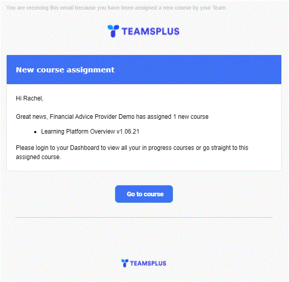 Learners/Users will receive an email notification via their business email account advising that a new course has been assigned to them (this takes place 1 hour after the course has been assigned). The Learner can click through to the course directly via the 'Go to course' button and/or set a date in their calendar for completion due date.