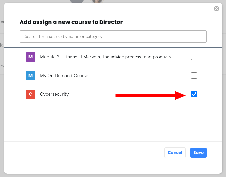 - Toggle courses on and off by clicking the checkboxes, and click 'Save' when done.  - Your changes will be visible in the assigned courses area.
