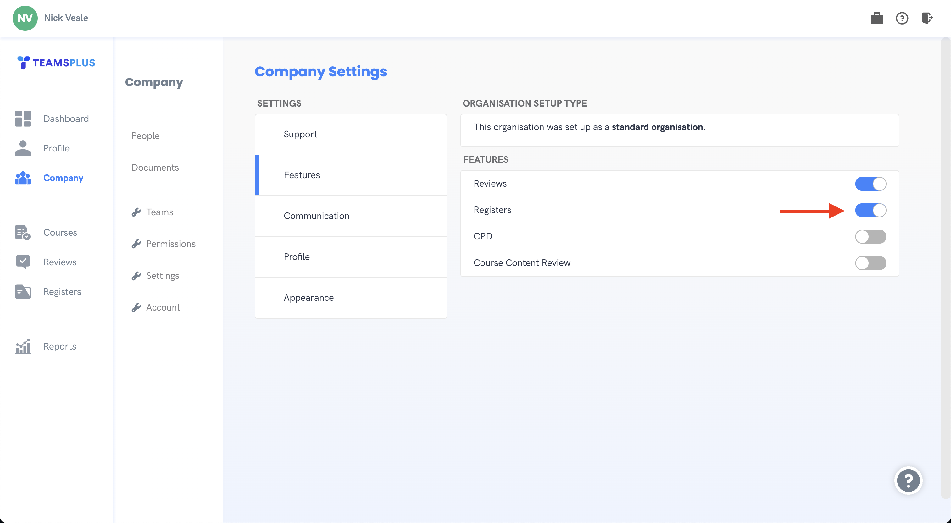 To check if your organisation has this feature activated, log in to Dacreed as a Super Admin and navigate to Company > Settings > Features to see if the 'Registers' toggle has been activated.