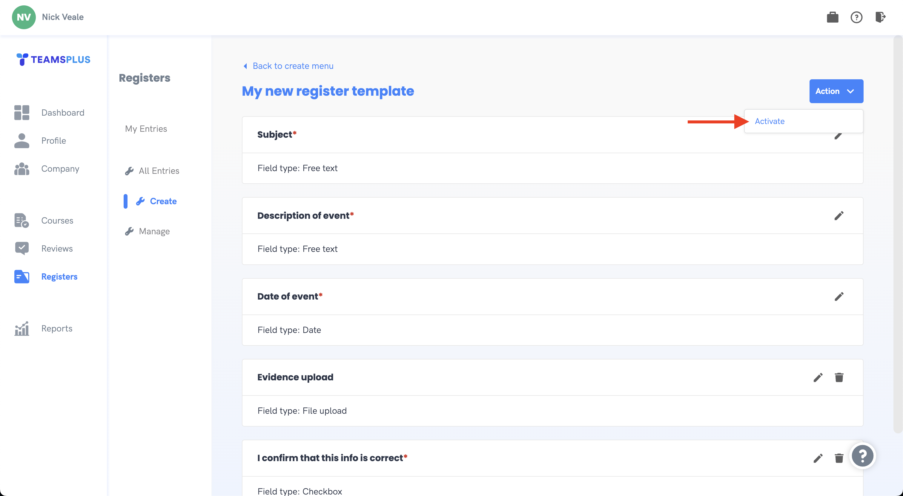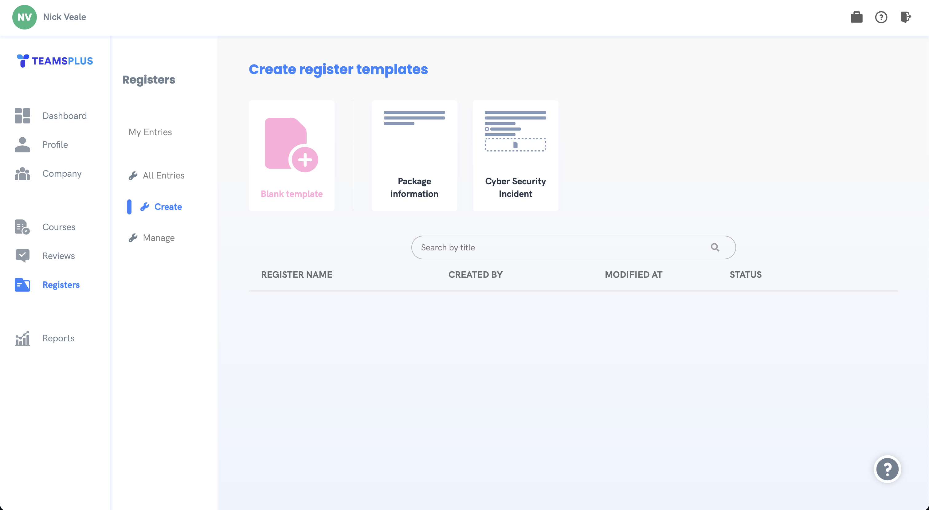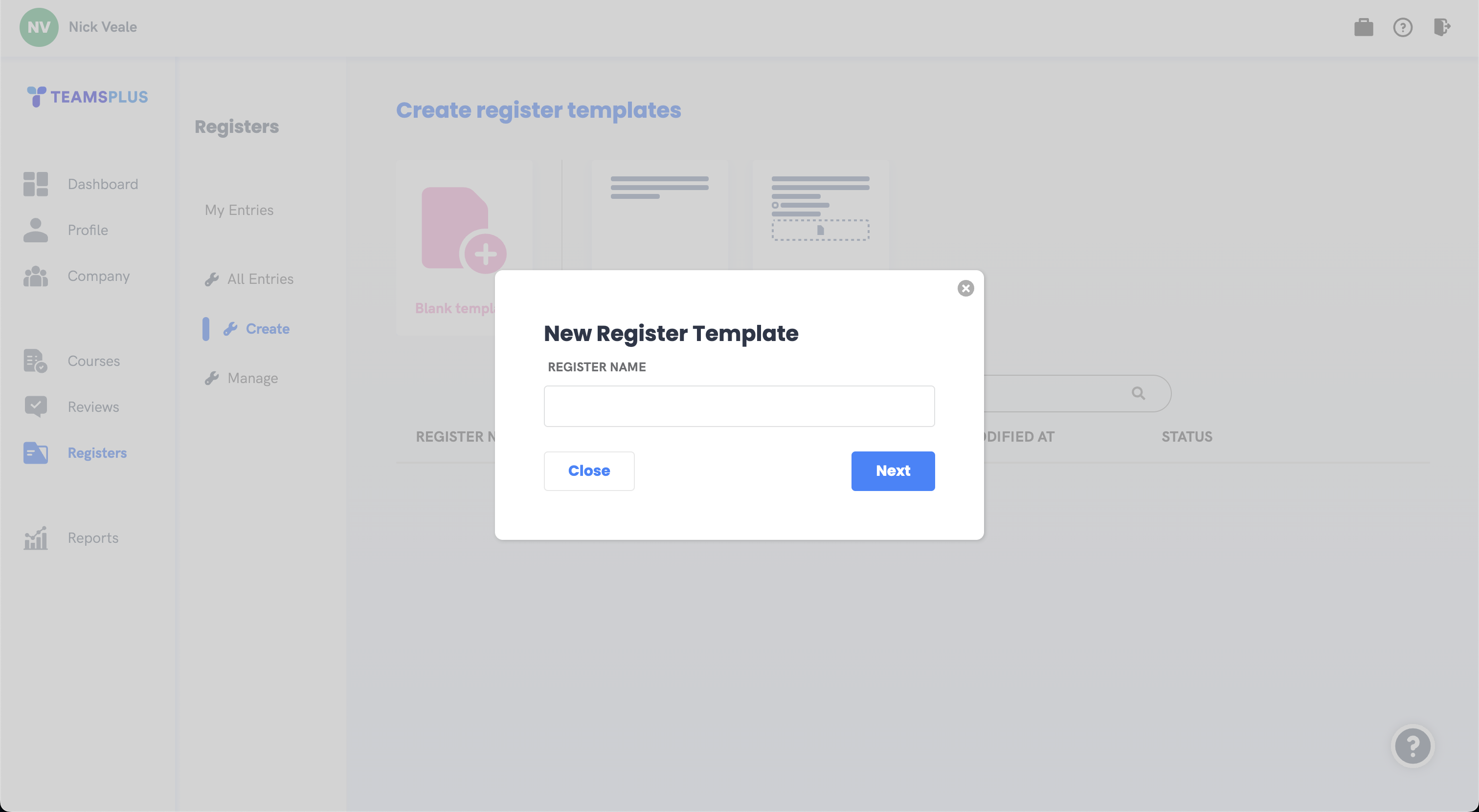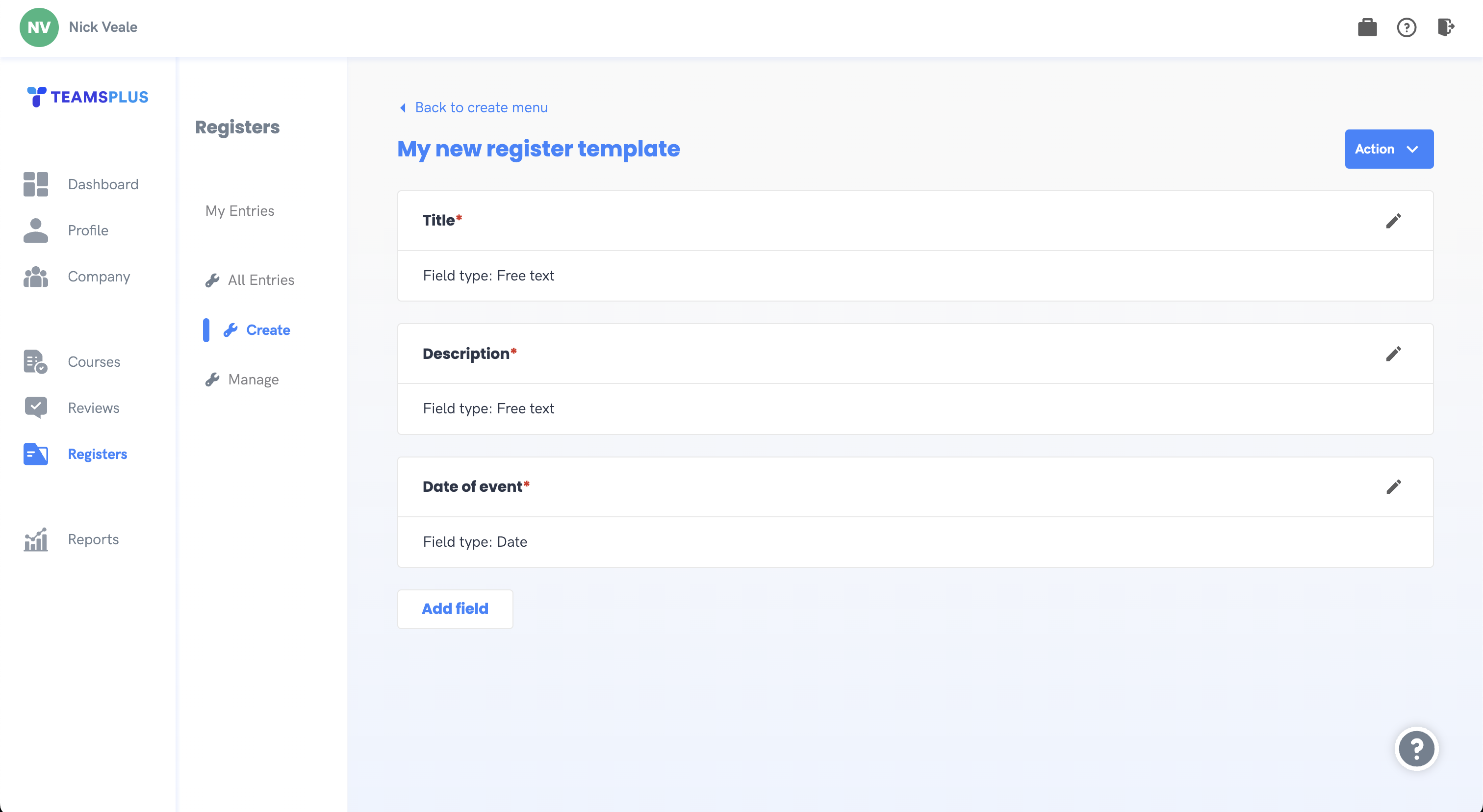 Begin by navigating to Registers > Create. Here we will create a register template for use on the platform.