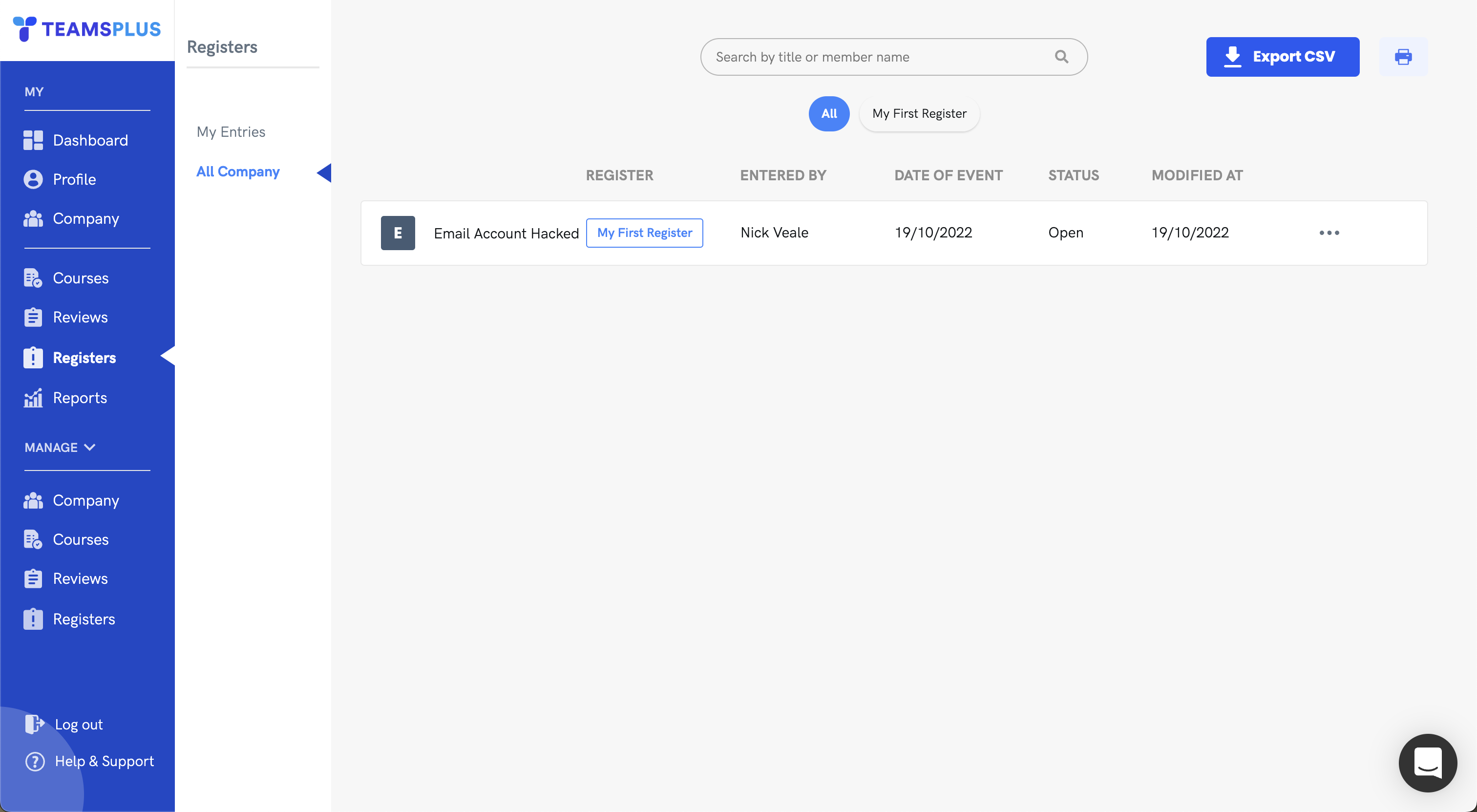 Users with HR Admin or Super Admin permissions will be able to view all register entries submitted in a company by navigating to Registers > All Entries.